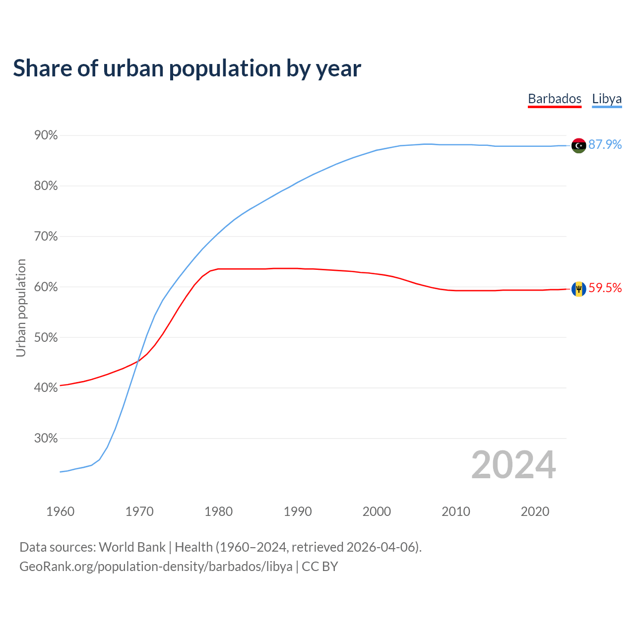 From 2004 to 2024, the share of urban population changed from 61.1% to 59.5% in Barbados and from 88% to 87.9% in Libya.