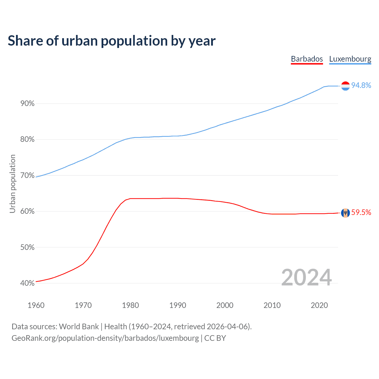 From 2004 to 2024, the share of urban population changed from 61.1% to 59.5% in Barbados and from 86% to 94.8% in Luxembourg.