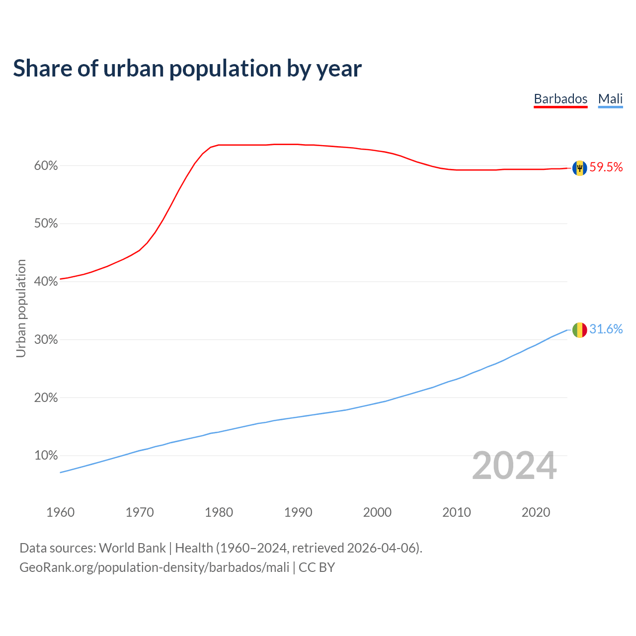 From 2004 to 2024, the share of urban population changed from 61.1% to 59.5% in Barbados and from 20.5% to 31.6% in Mali.