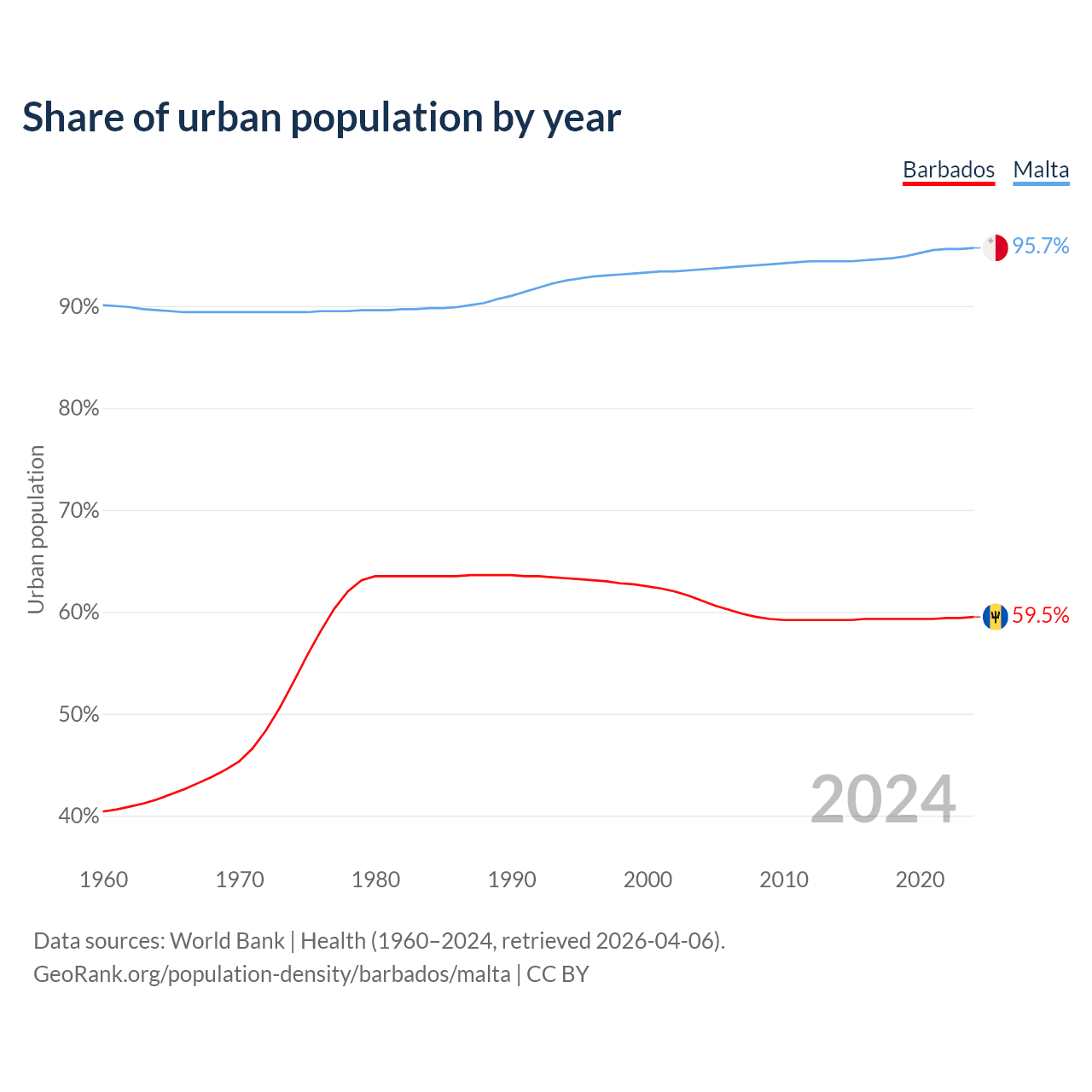From 2004 to 2024, the share of urban population changed from 61.1% to 59.5% in Barbados and from 93.6% to 95.7% in Malta.