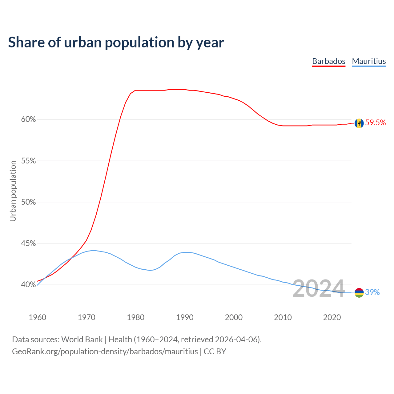 From 2004 to 2024, the share of urban population changed from 61.1% to 59.5% in Barbados and from 41.3% to 39% in Mauritius.