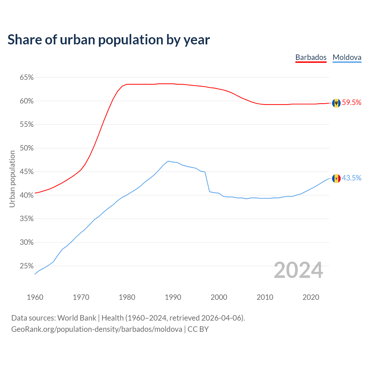 From 2004 to 2024, the share of urban population changed from 61.1% to 59.5% in Barbados and from 39.4% to 43.5% in Moldova.