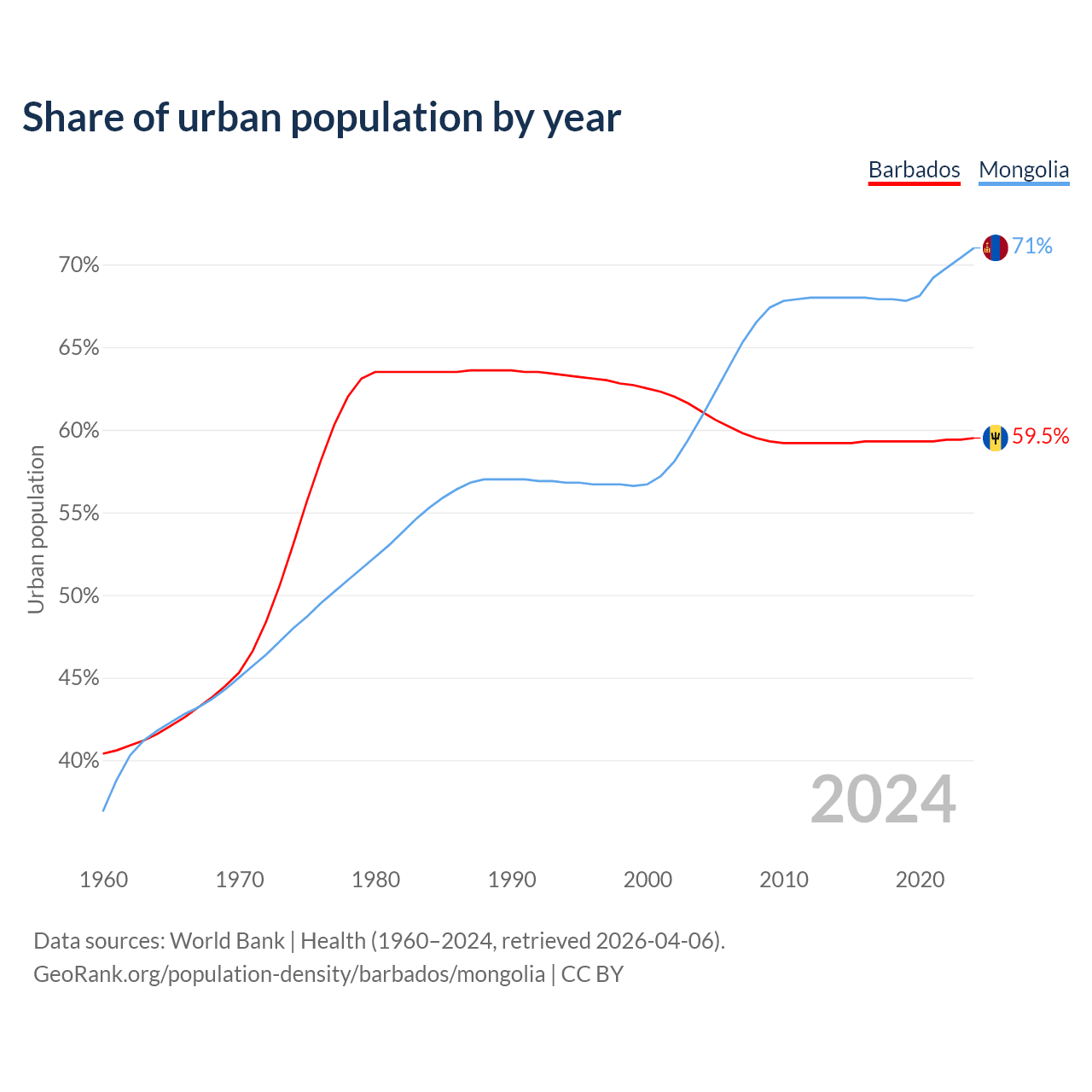 From 2004 to 2024, the share of urban population changed from 61.1% to 59.5% in Barbados and from 60.8% to 71% in Mongolia.
