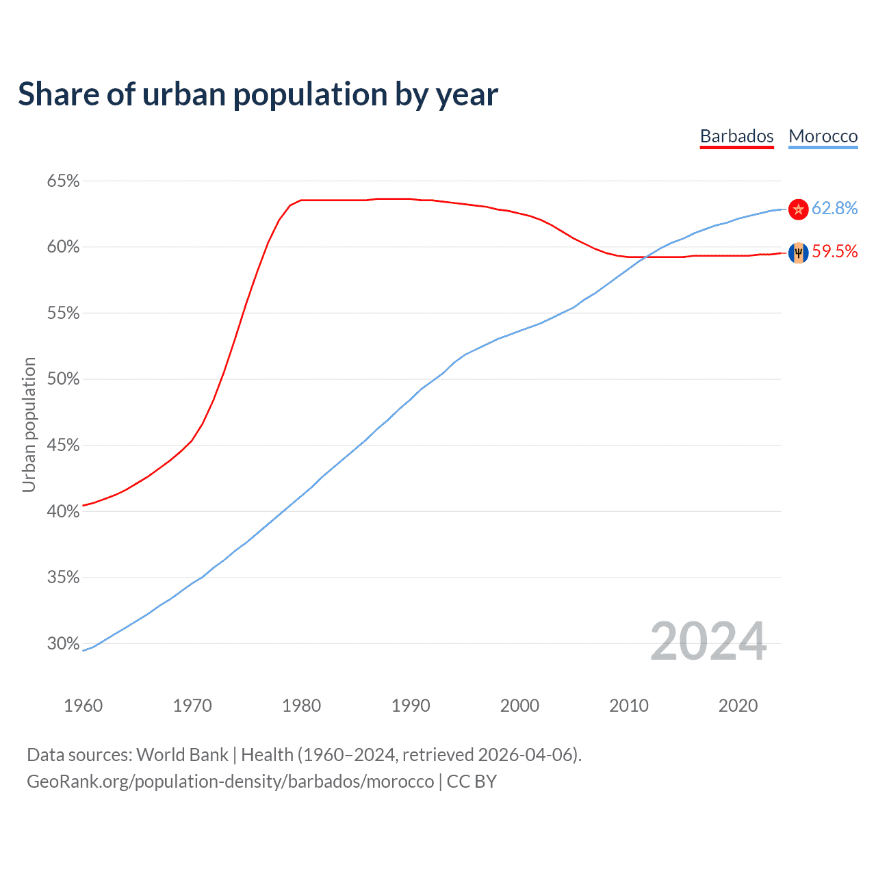 From 2004 to 2024, the share of urban population changed from 61.1% to 59.5% in Barbados and from 55% to 62.8% in Morocco.