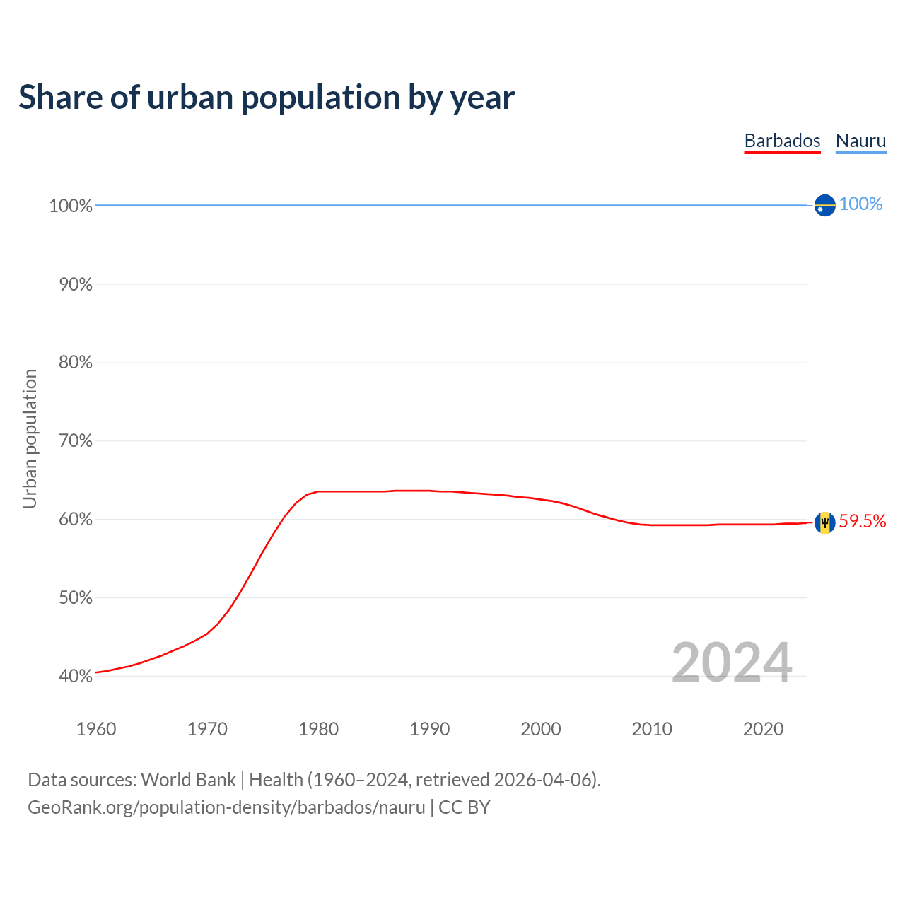 From 2004 to 2024, the share of urban population changed from 61.1% to 59.5% in Barbados and from 100% to 100% in Nauru.