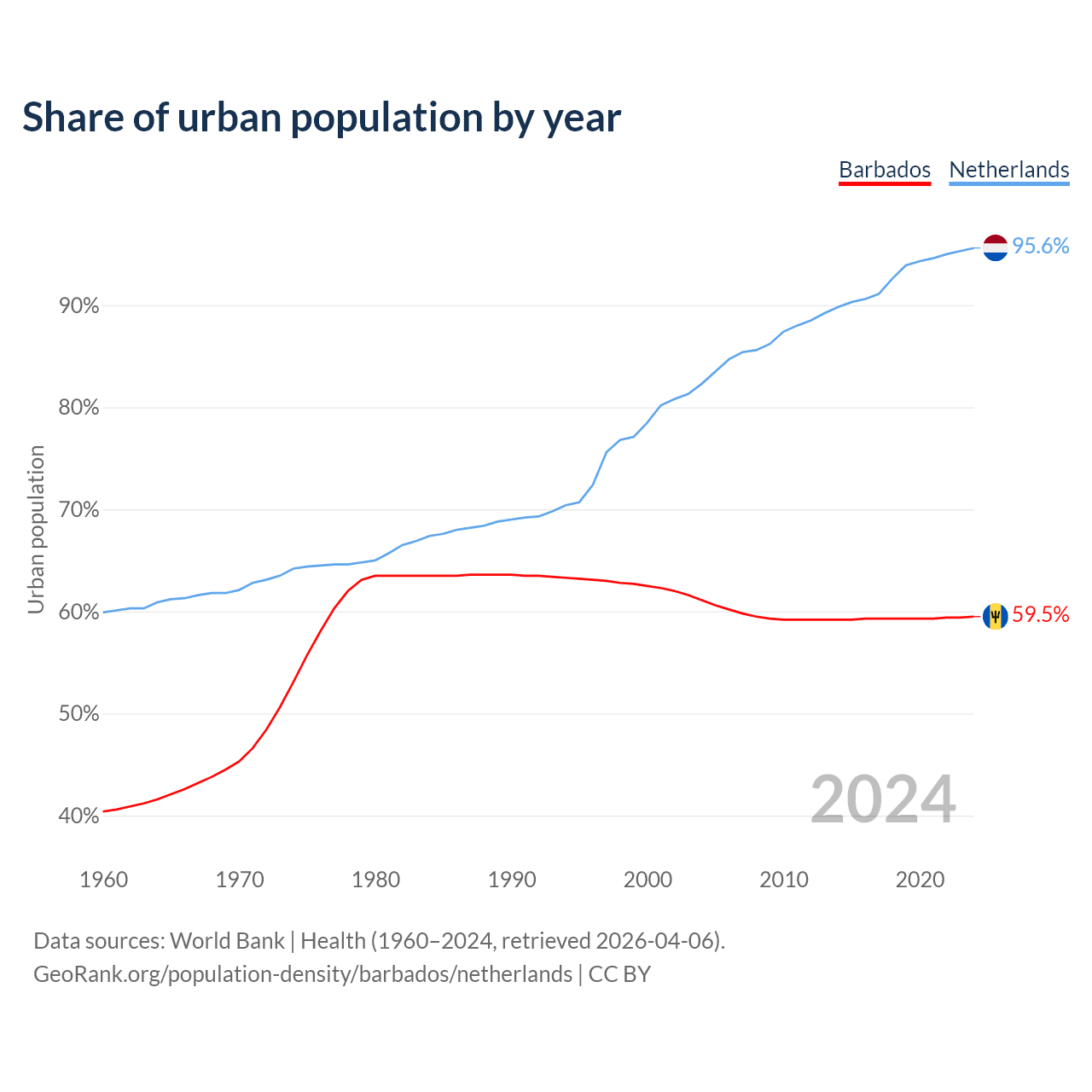 From 2004 to 2024, the share of urban population changed from 61.1% to 59.5% in Barbados and from 82.3% to 95.6% in the Netherlands.