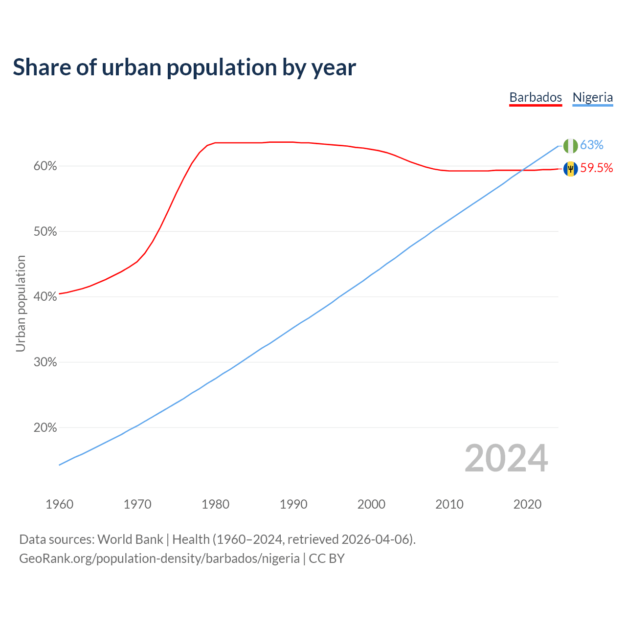 From 2004 to 2024, the share of urban population changed from 61.1% to 59.5% in Barbados and from 46.7% to 63% in Nigeria.