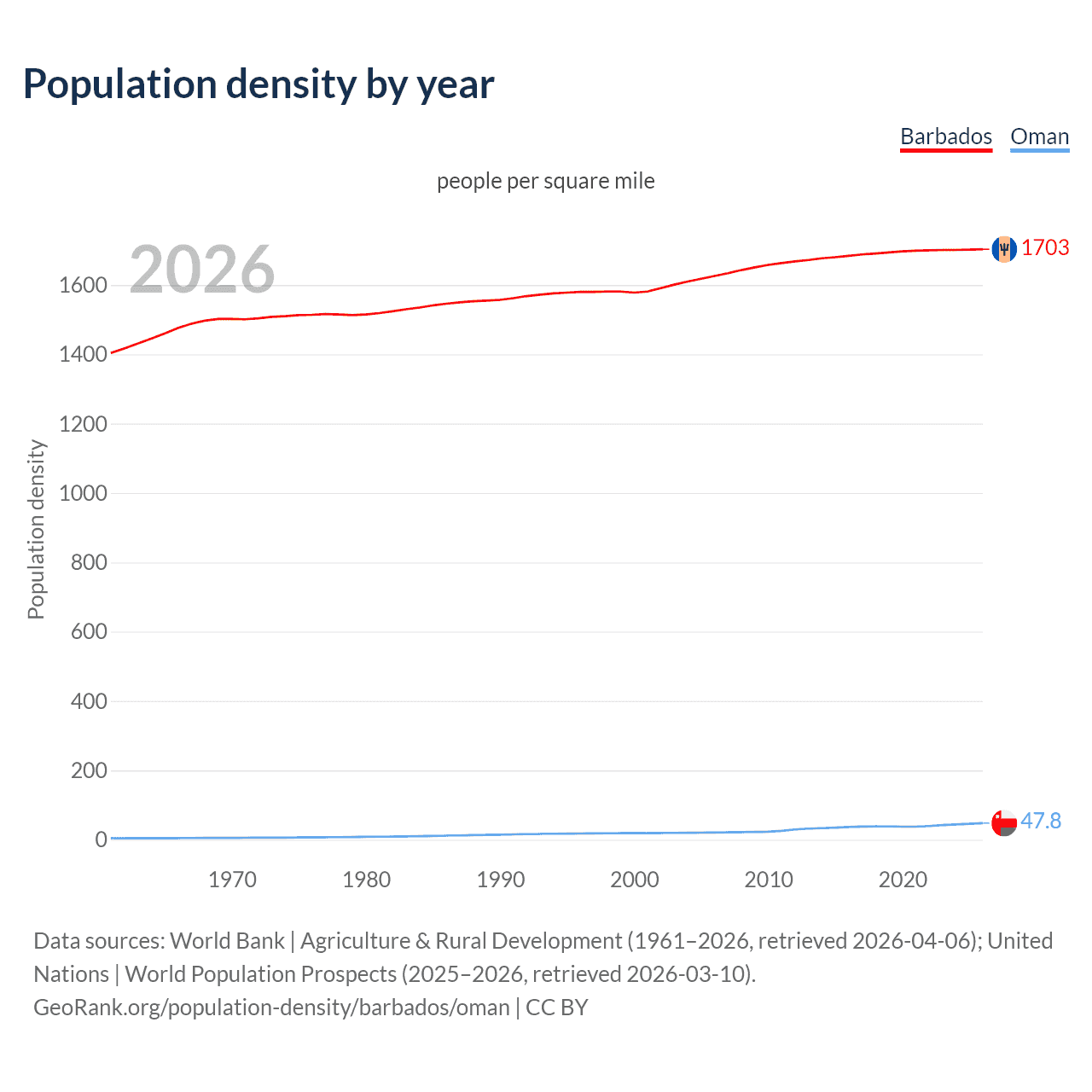 From 2006 to 2026, population density in Barbados increased by 4.73%, compared to a 127.4% growth in Oman.