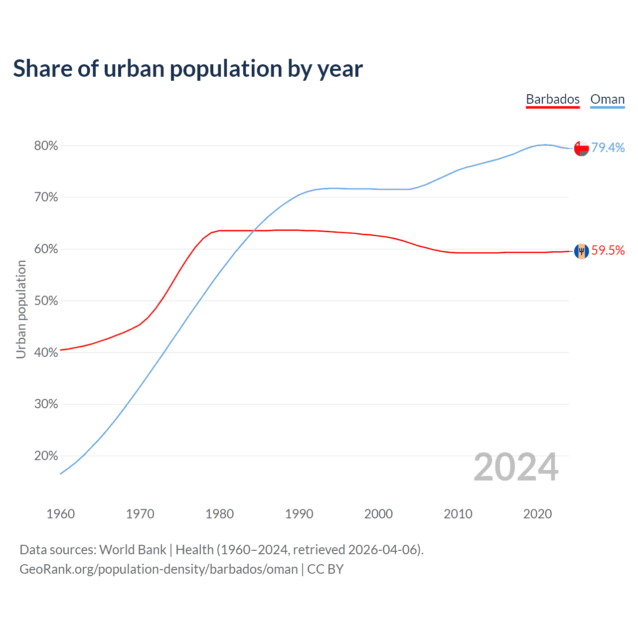 From 2004 to 2024, the share of urban population changed from 61.1% to 59.5% in Barbados and from 71.5% to 79.4% in Oman.