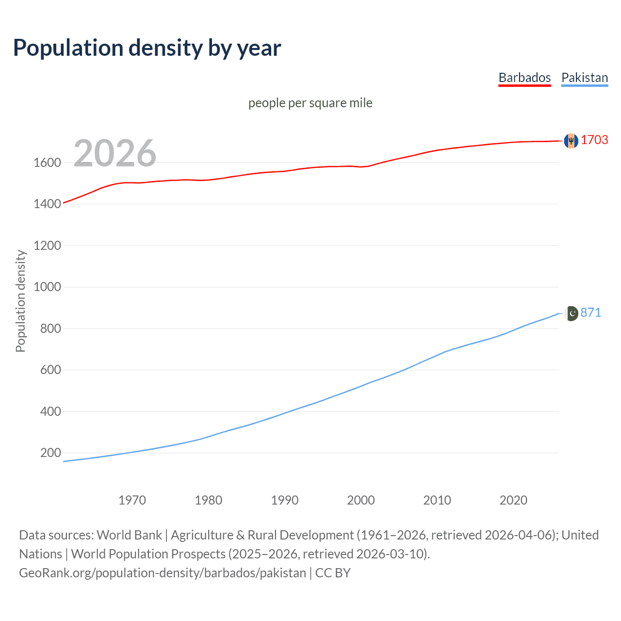 From 2006 to 2026, population density in Barbados increased by 4.73%, compared to a 44.3% growth in Pakistan.