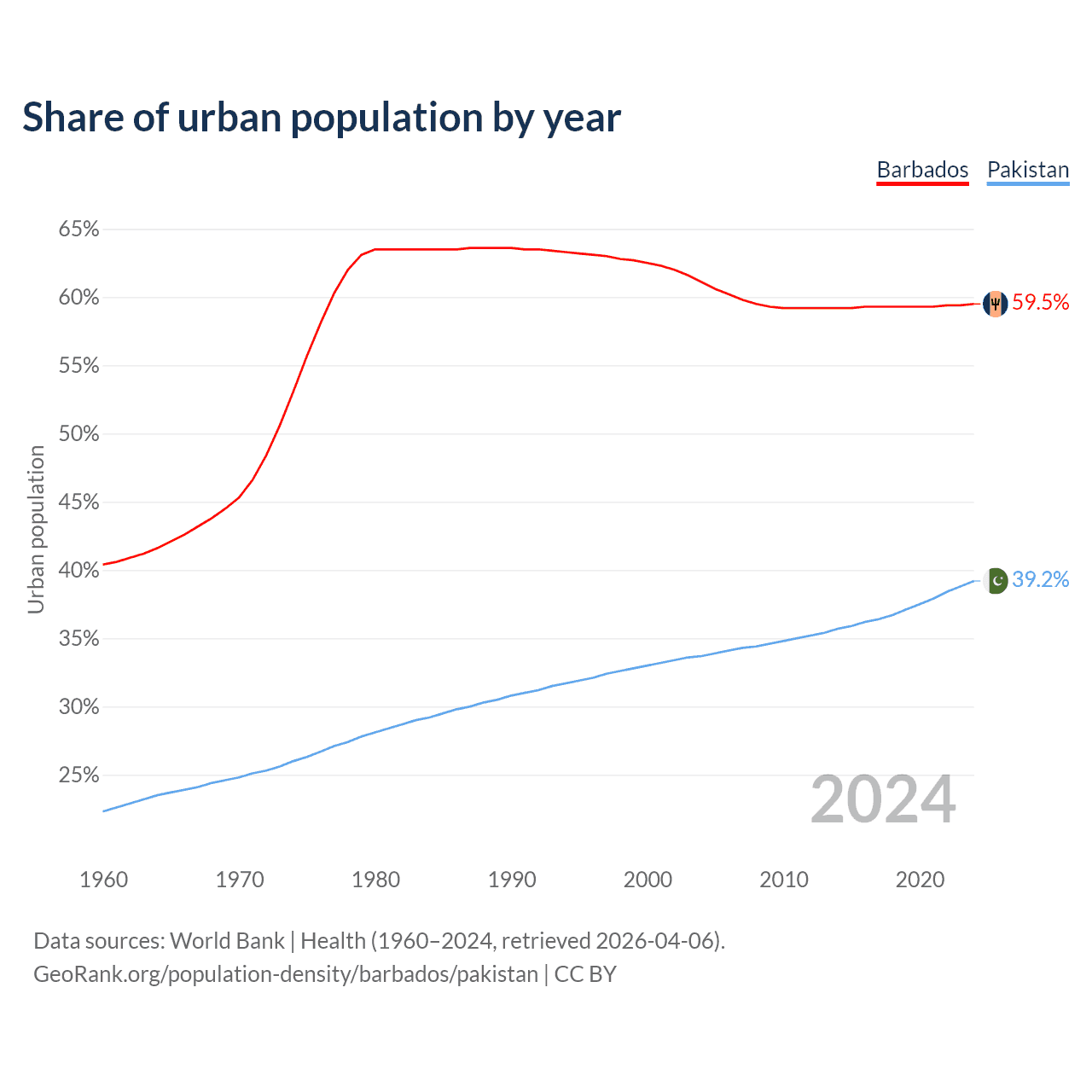 From 2004 to 2024, the share of urban population changed from 61.1% to 59.5% in Barbados and from 33.7% to 39.2% in Pakistan.