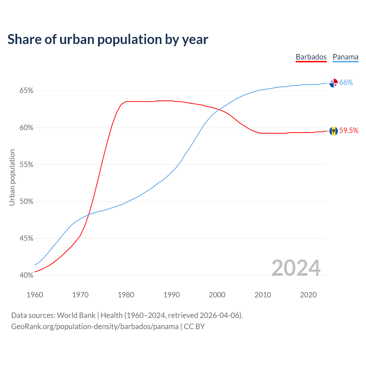 From 2004 to 2024, the share of urban population changed from 61.1% to 59.5% in Barbados and from 63.8% to 66% in Panama.