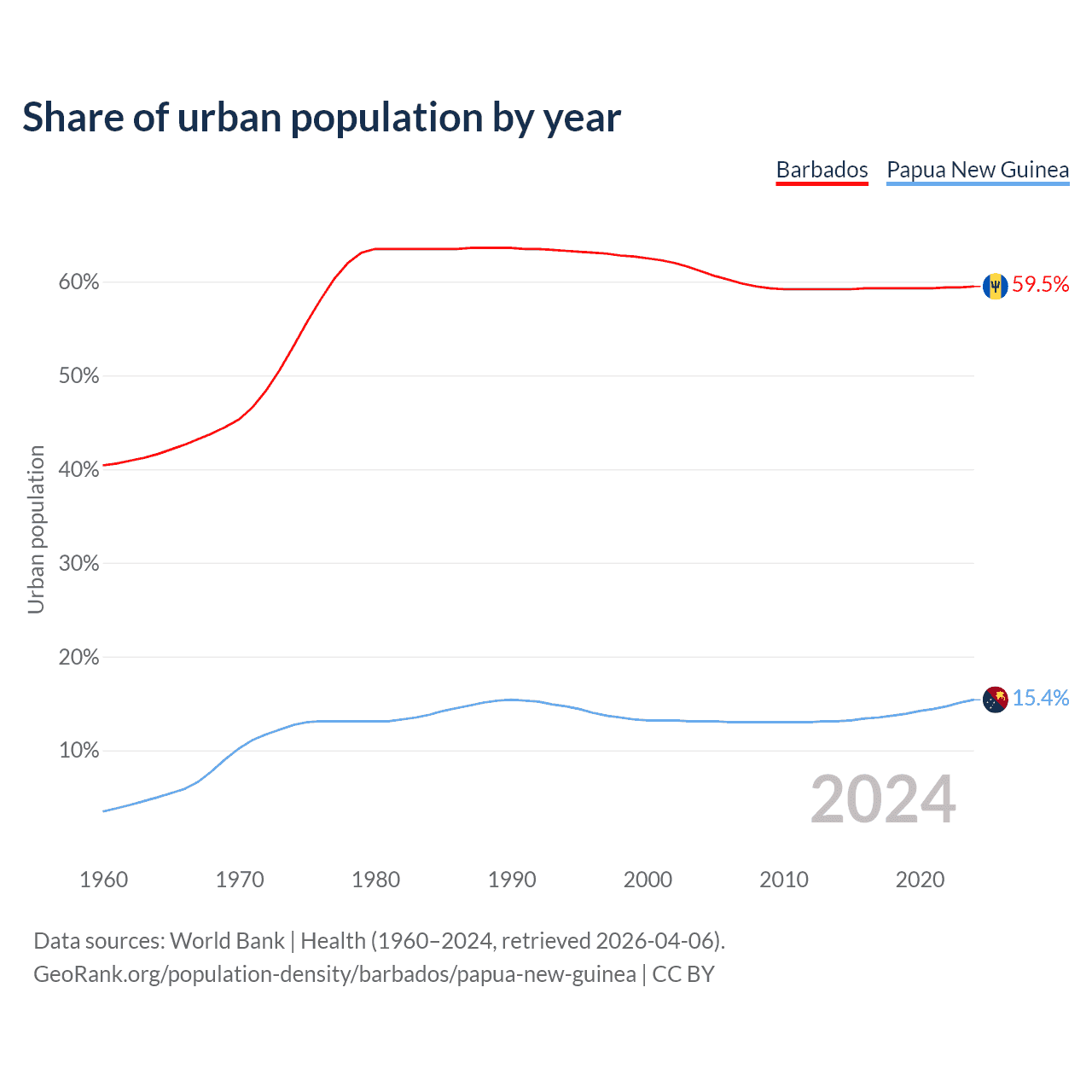 From 2004 to 2024, the share of urban population changed from 61.1% to 59.5% in Barbados and from 13.1% to 15.4% in Papua New Guinea.