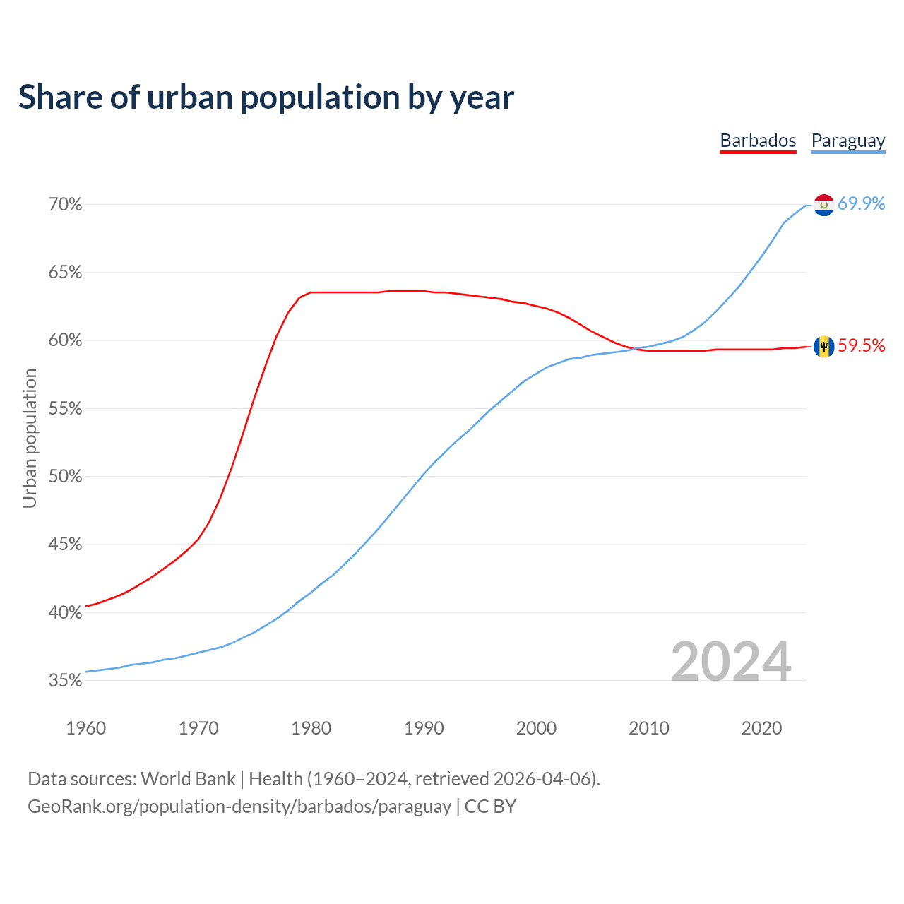 From 2004 to 2024, the share of urban population changed from 61.1% to 59.5% in Barbados and from 58.7% to 69.9% in Paraguay.