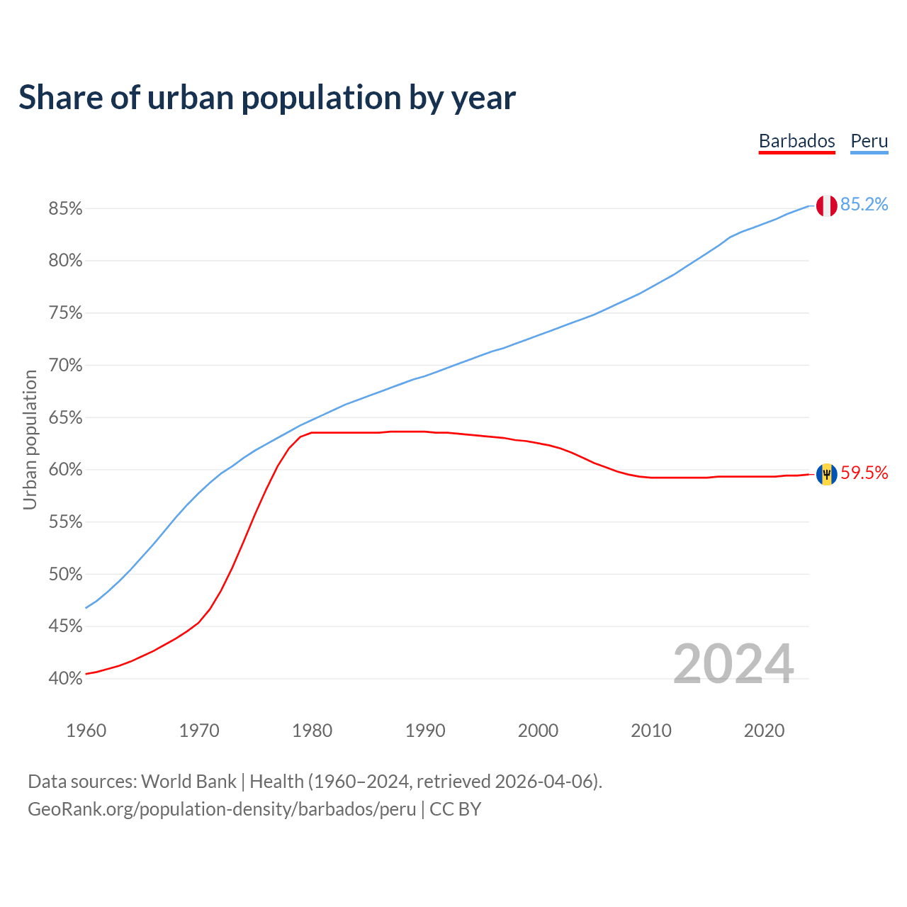 From 2004 to 2024, the share of urban population changed from 61.1% to 59.5% in Barbados and from 74.4% to 85.2% in Peru.