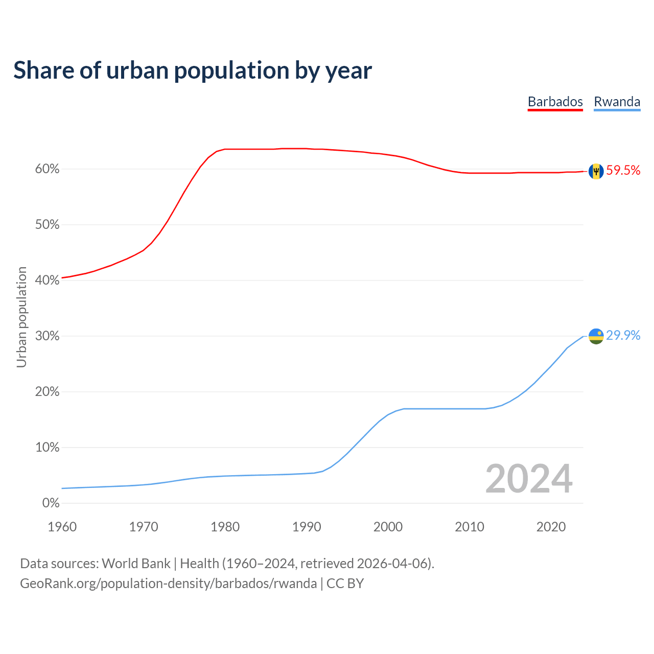 From 2004 to 2024, the share of urban population changed from 61.1% to 59.5% in Barbados and from 16.9% to 29.9% in Rwanda.