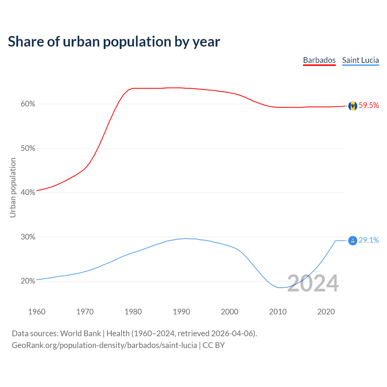 From 2004 to 2024, the share of urban population changed from 61.1% to 59.5% in Barbados and from 24.8% to 29.1% in Saint Lucia.