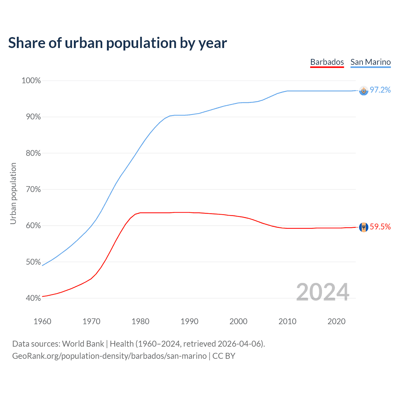 From 2004 to 2024, the share of urban population changed from 61.1% to 59.5% in Barbados and from 94.2% to 97.2% in San Marino.