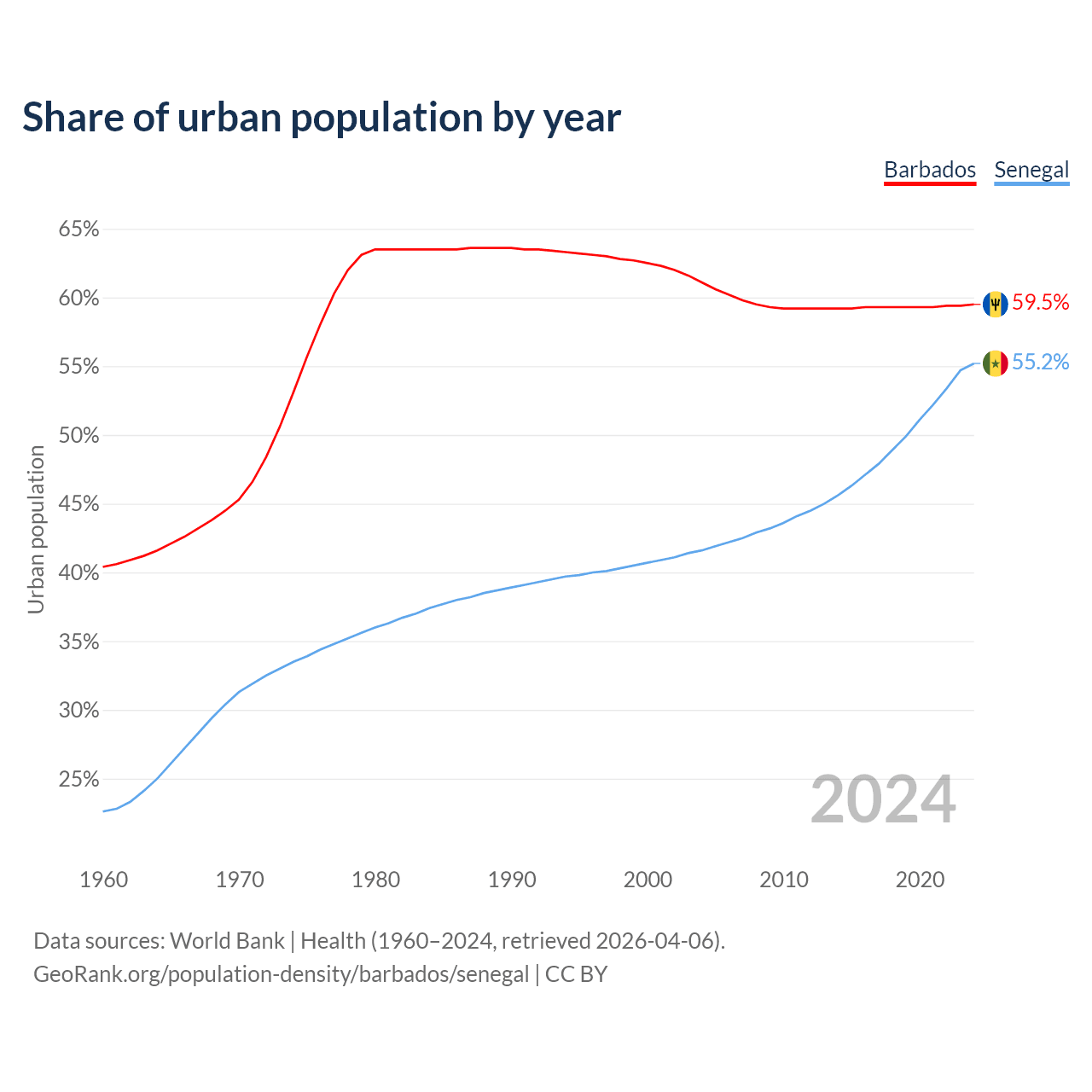 From 2004 to 2024, the share of urban population changed from 61.1% to 59.5% in Barbados and from 41.6% to 55.2% in Senegal.