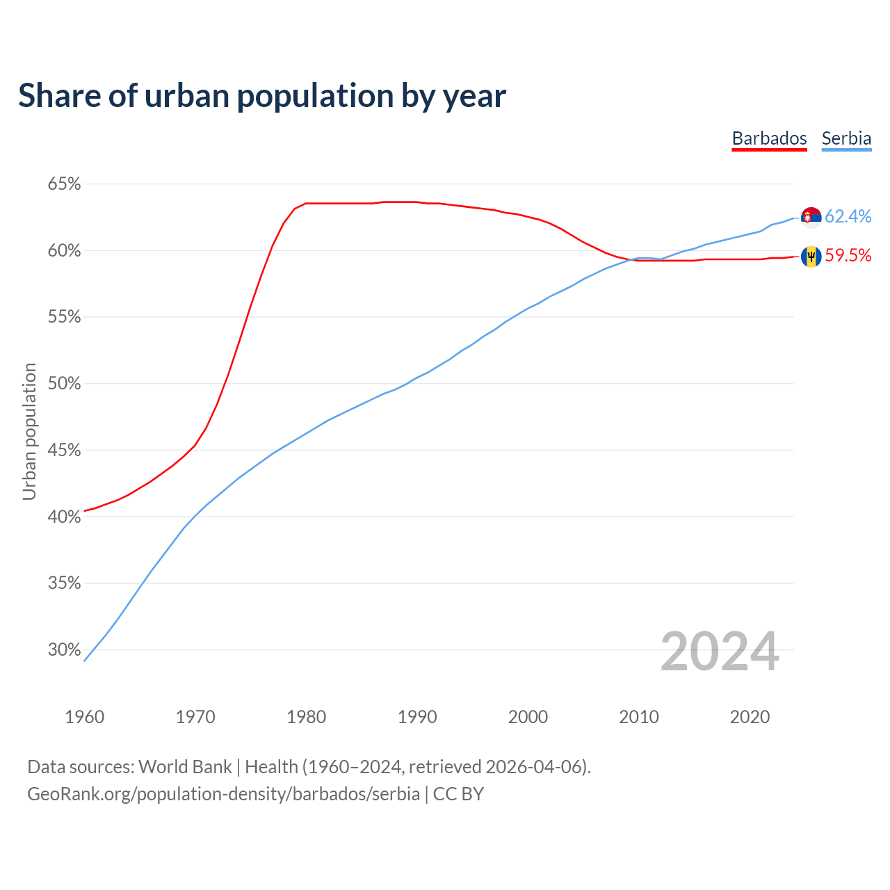 From 2004 to 2024, the share of urban population changed from 61.1% to 59.5% in Barbados and from 57.3% to 62.4% in Serbia.