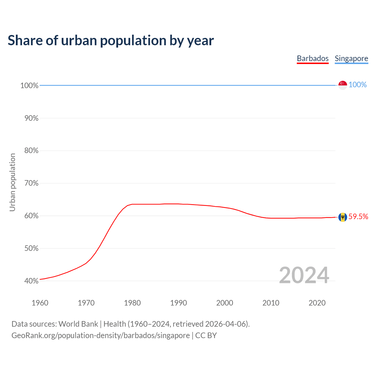 From 2004 to 2024, the share of urban population changed from 61.1% to 59.5% in Barbados and from 100% to 100% in Singapore.