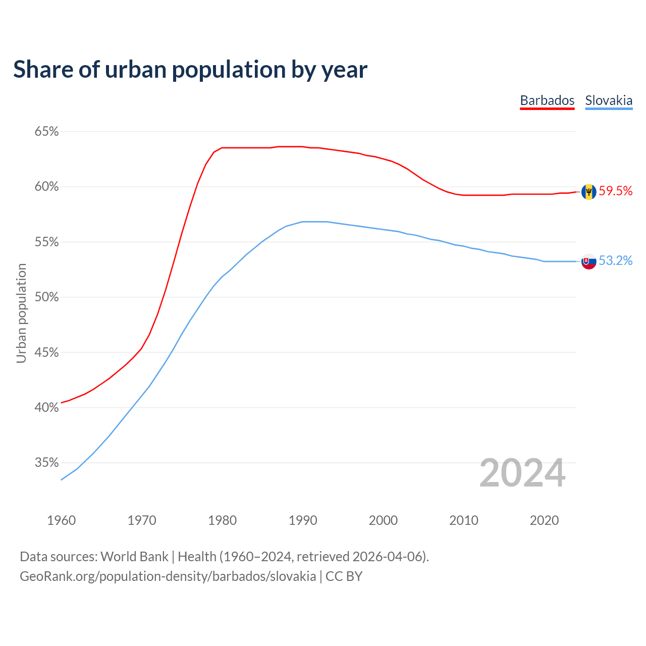 From 2004 to 2024, the share of urban population changed from 61.1% to 59.5% in Barbados and from 55.6% to 53.2% in Slovakia.
