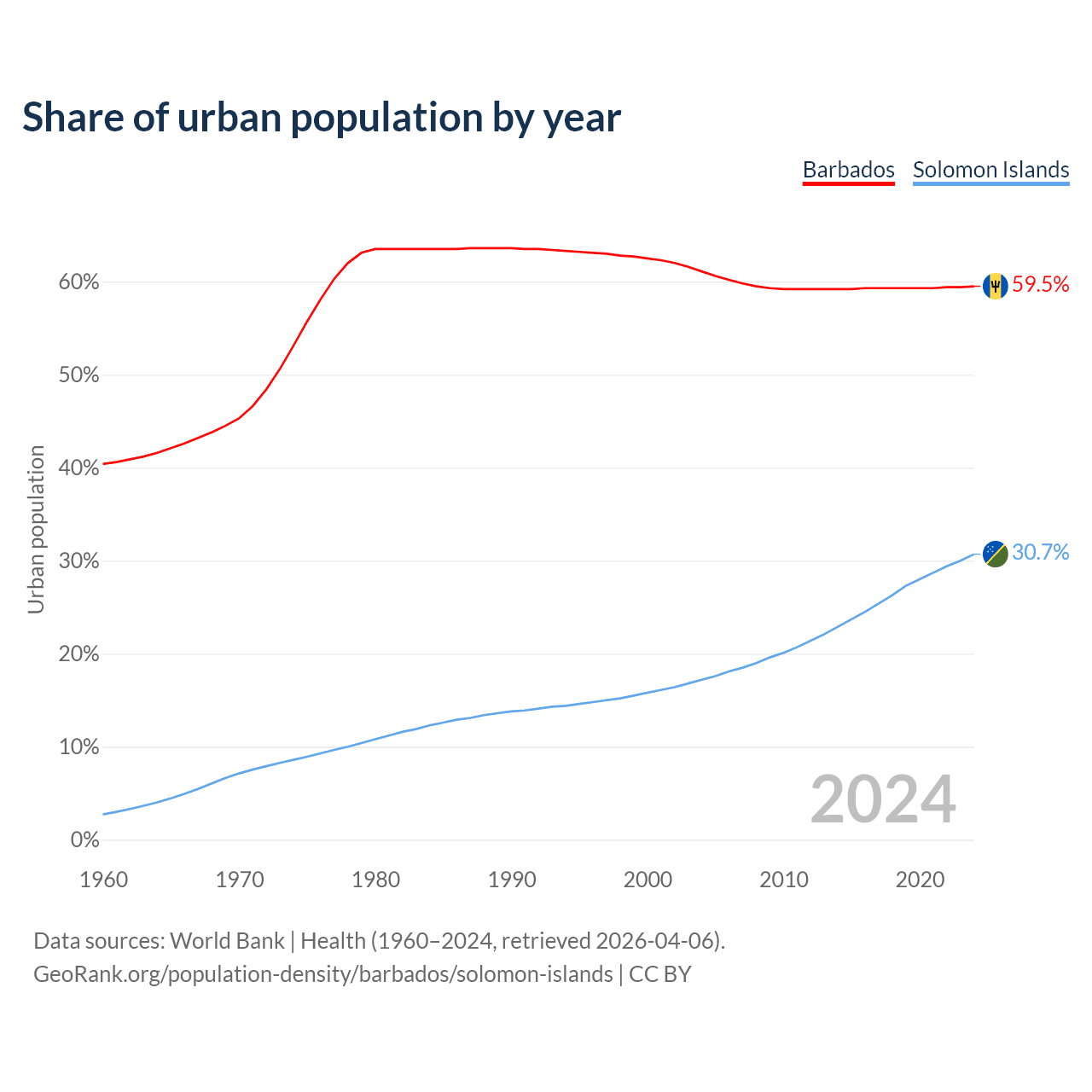 From 2004 to 2024, the share of urban population changed from 61.1% to 59.5% in Barbados and from 17.2% to 30.7% in the Solomon Islands.