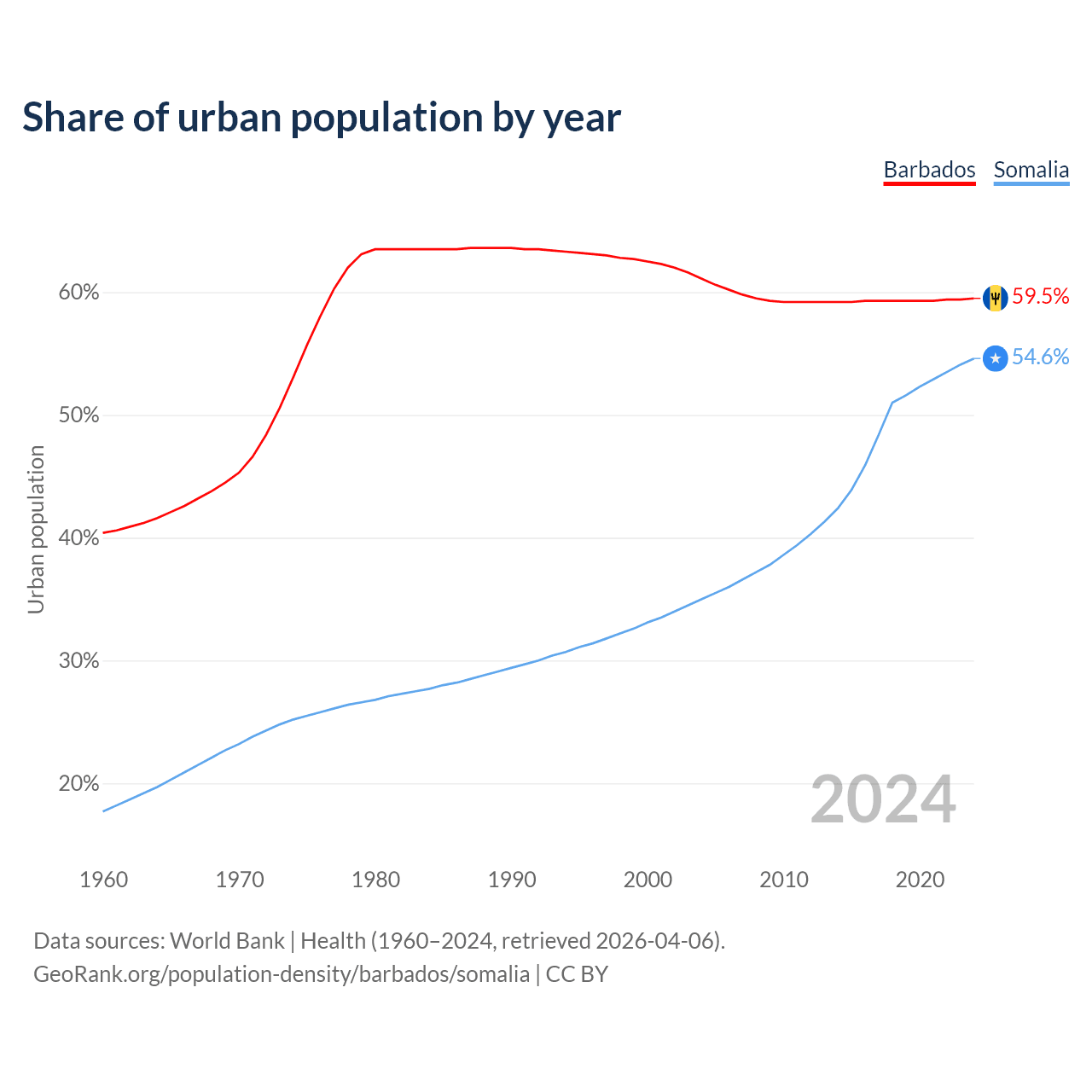 From 2004 to 2024, the share of urban population changed from 61.1% to 59.5% in Barbados and from 35% to 54.6% in Somalia.