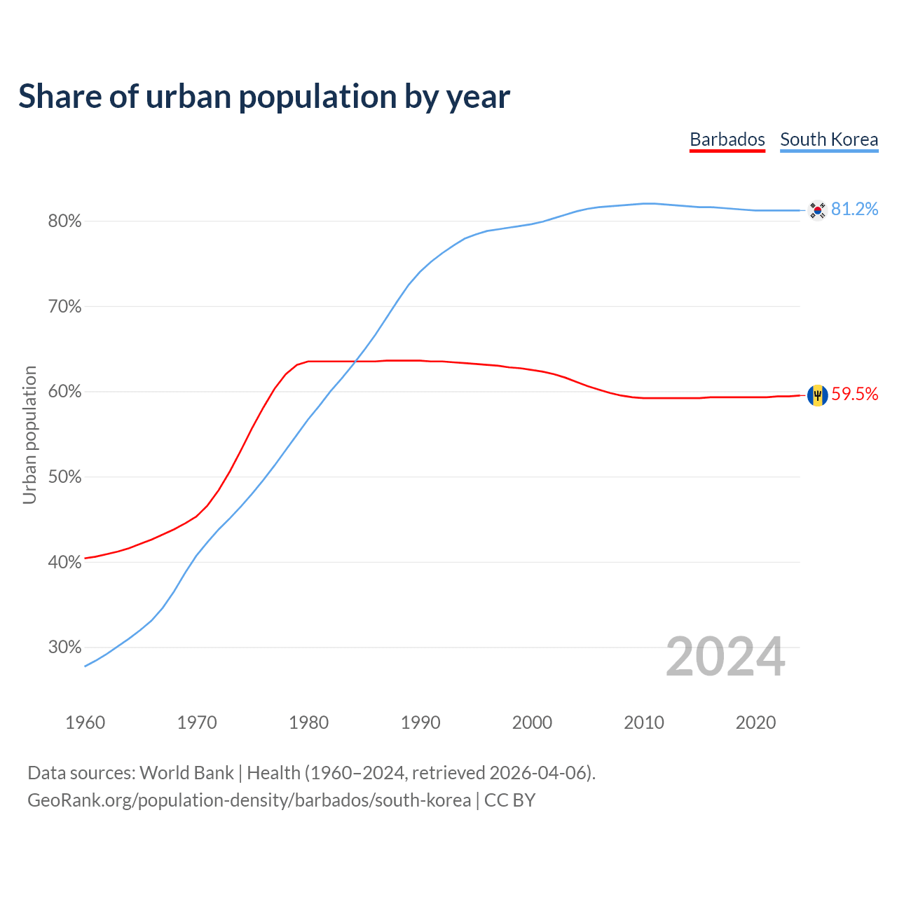 From 2004 to 2024, the share of urban population changed from 61.1% to 59.5% in Barbados and from 81.1% to 81.2% in South Korea.