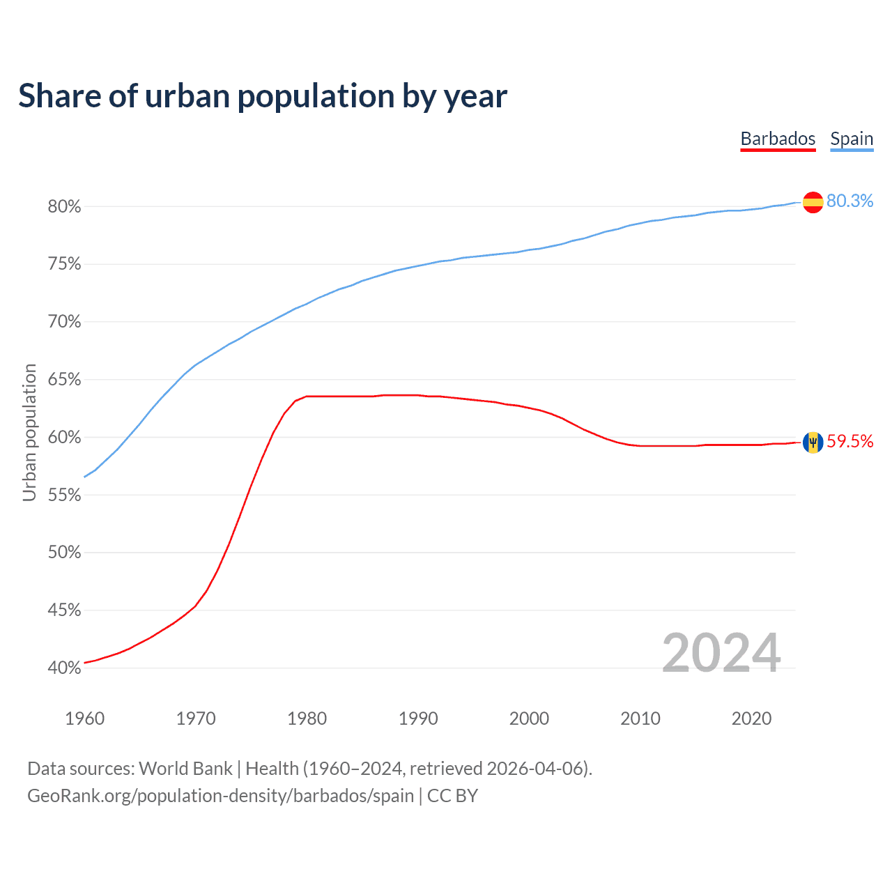 From 2004 to 2024, the share of urban population changed from 61.1% to 59.5% in Barbados and from 77% to 80.3% in Spain.