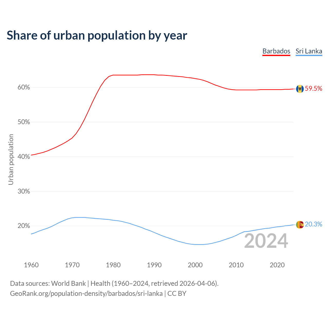 From 2004 to 2024, the share of urban population changed from 61.1% to 59.5% in Barbados and from 14.9% to 20.3% in Sri Lanka.