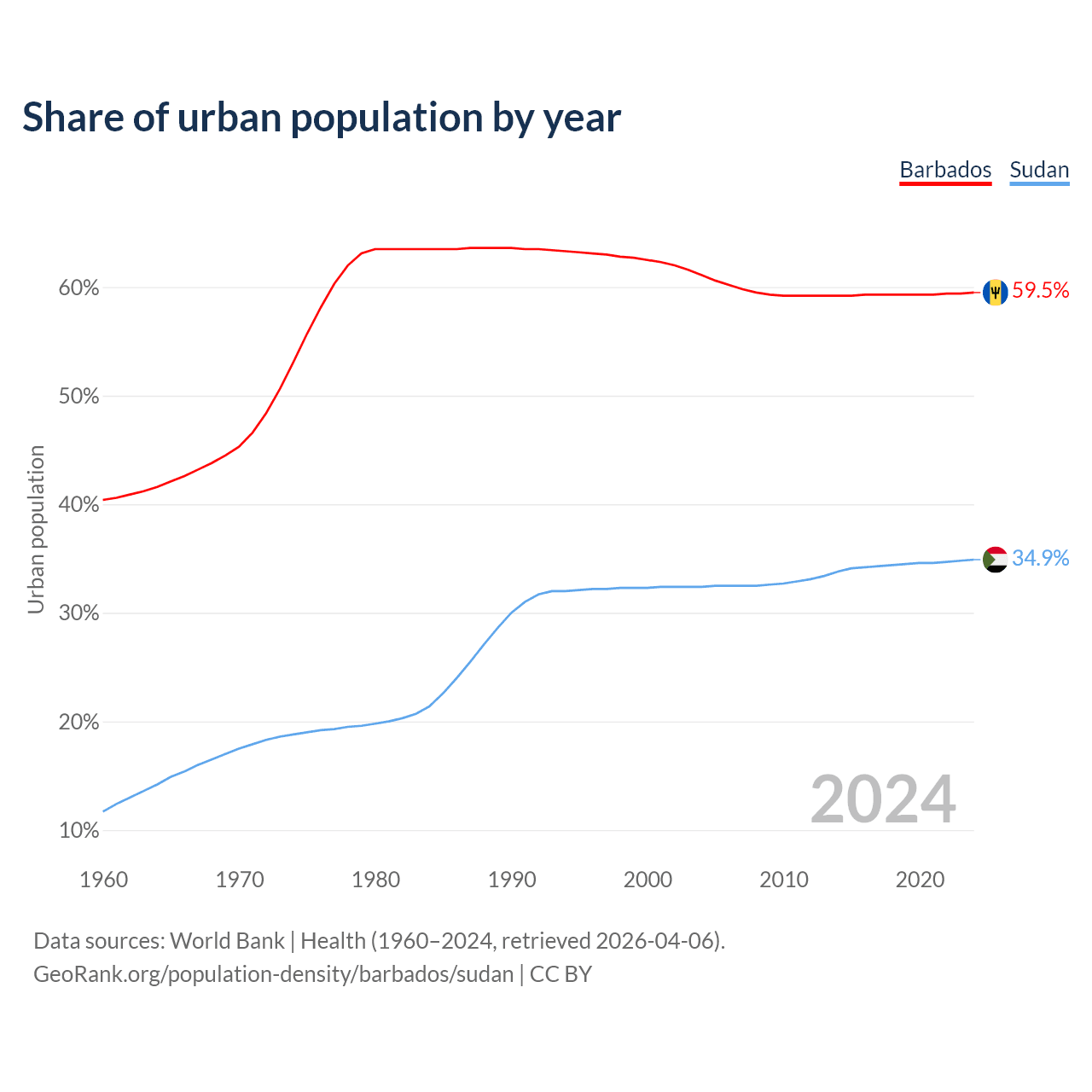From 2004 to 2024, the share of urban population changed from 61.1% to 59.5% in Barbados and from 32.4% to 34.9% in Sudan.