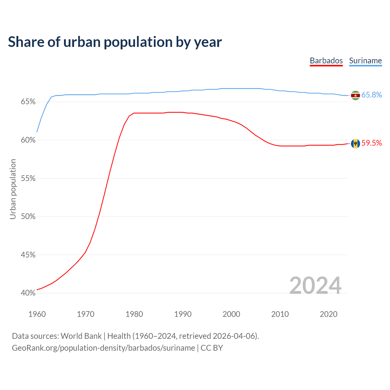 From 2004 to 2024, the share of urban population changed from 61.1% to 59.5% in Barbados and from 66.7% to 65.8% in Suriname.