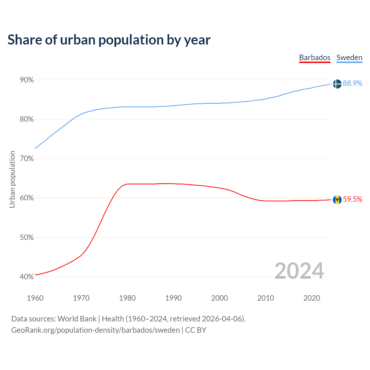 From 2004 to 2024, the share of urban population changed from 61.1% to 59.5% in Barbados and from 84.3% to 88.9% in Sweden.