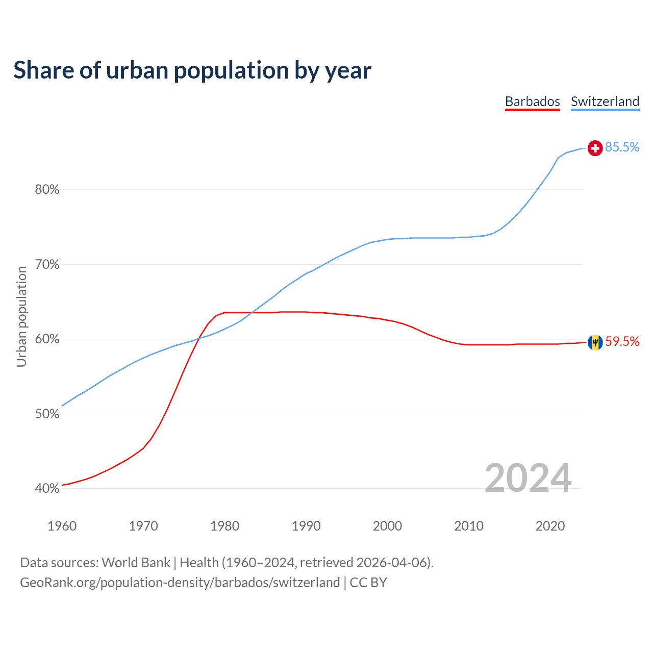 From 2004 to 2024, the share of urban population changed from 61.1% to 59.5% in Barbados and from 73.5% to 85.5% in Switzerland.