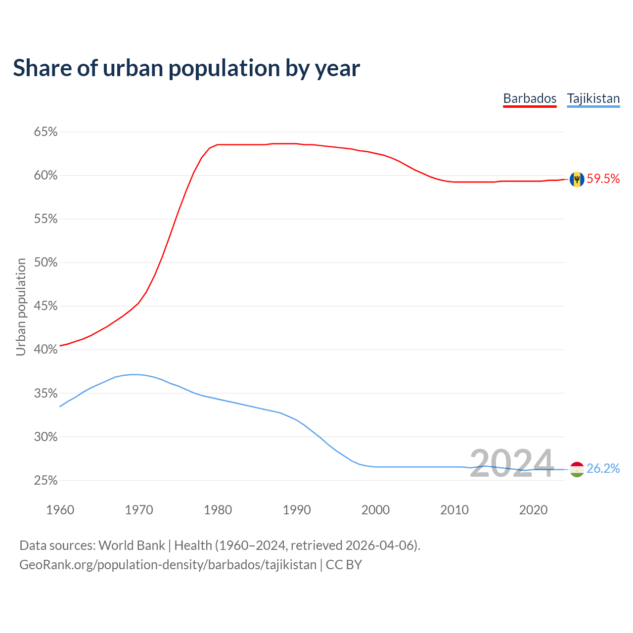 From 2004 to 2024, the share of urban population changed from 61.1% to 59.5% in Barbados and from 26.5% to 26.2% in Tajikistan.