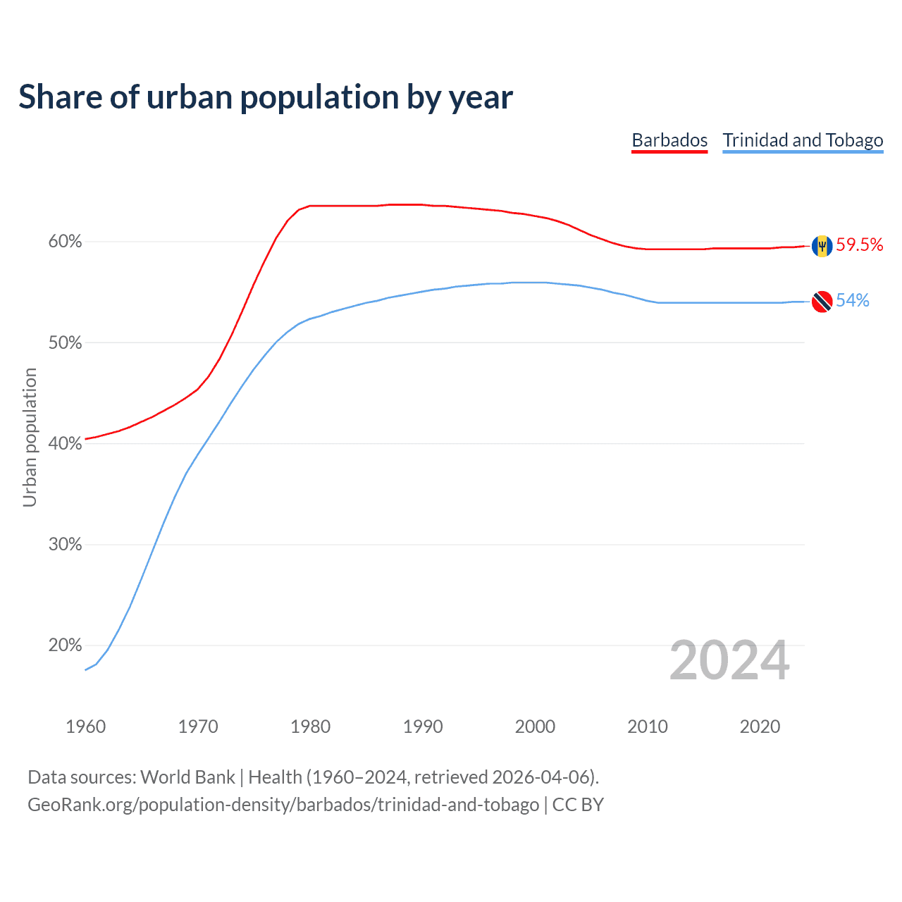 From 2004 to 2024, the share of urban population changed from 61.1% to 59.5% in Barbados and from 55.6% to 54% in Trinidad and Tobago.
