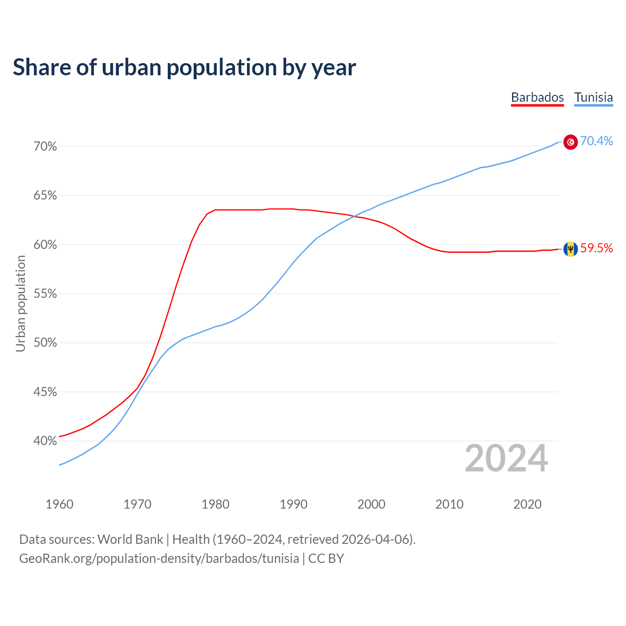 From 2004 to 2024, the share of urban population changed from 61.1% to 59.5% in Barbados and from 64.9% to 70.4% in Tunisia.