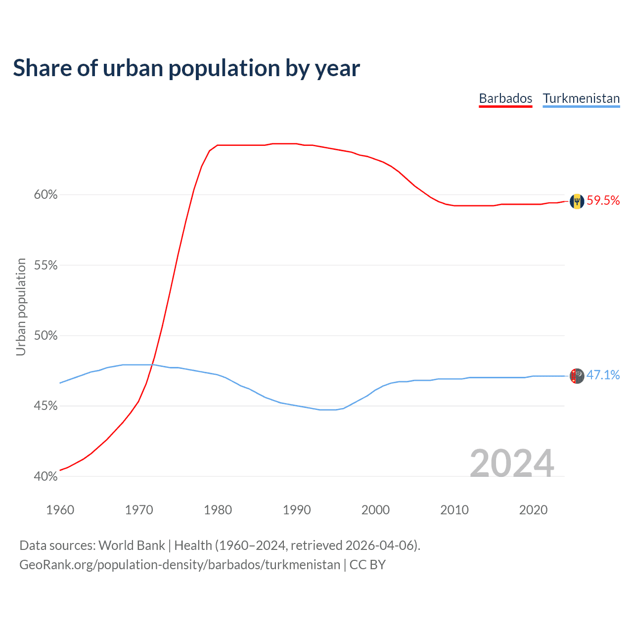 From 2004 to 2024, the share of urban population changed from 61.1% to 59.5% in Barbados and from 46.7% to 47.1% in Turkmenistan.