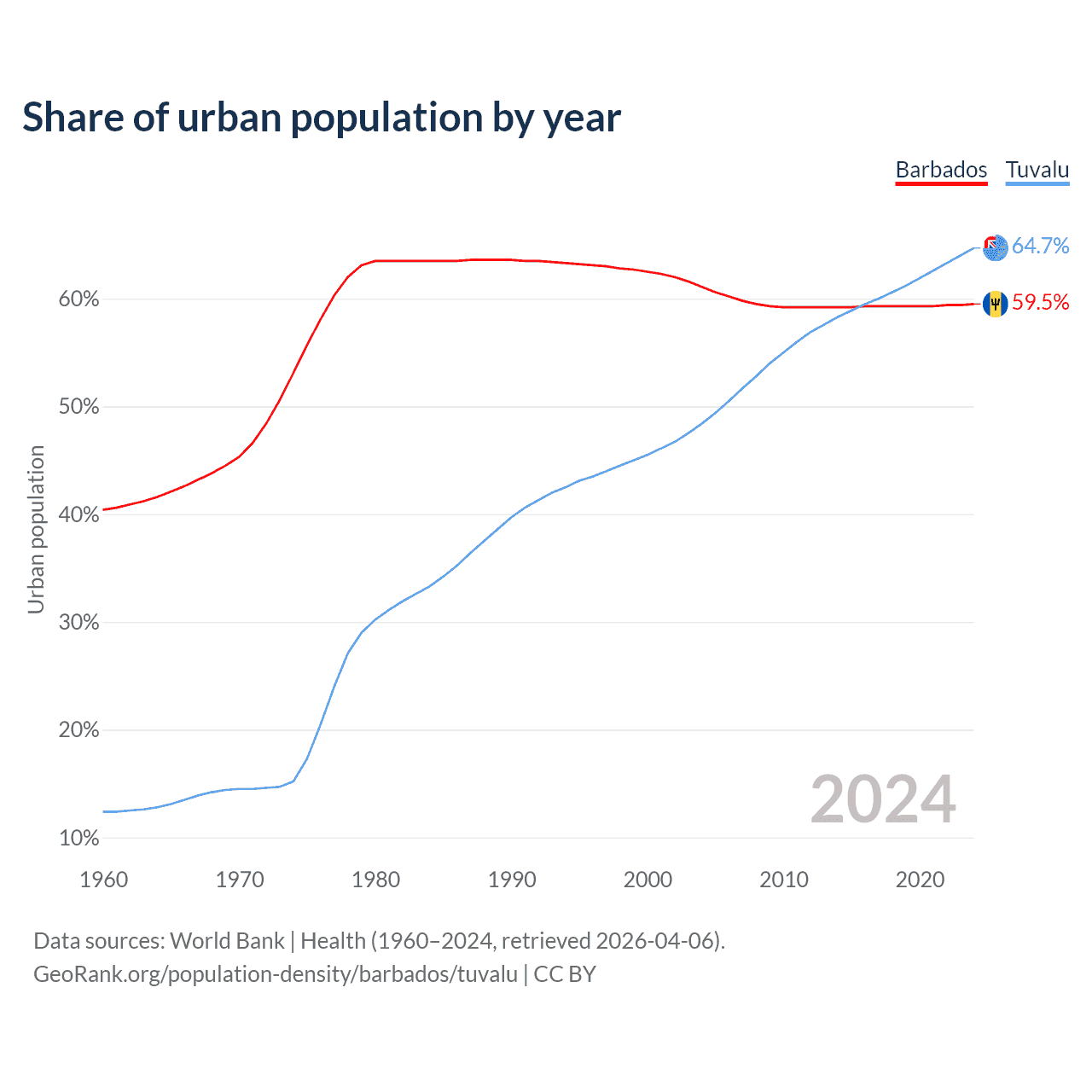 From 2004 to 2024, the share of urban population changed from 61.1% to 59.5% in Barbados and from 48.4% to 64.7% in Tuvalu.
