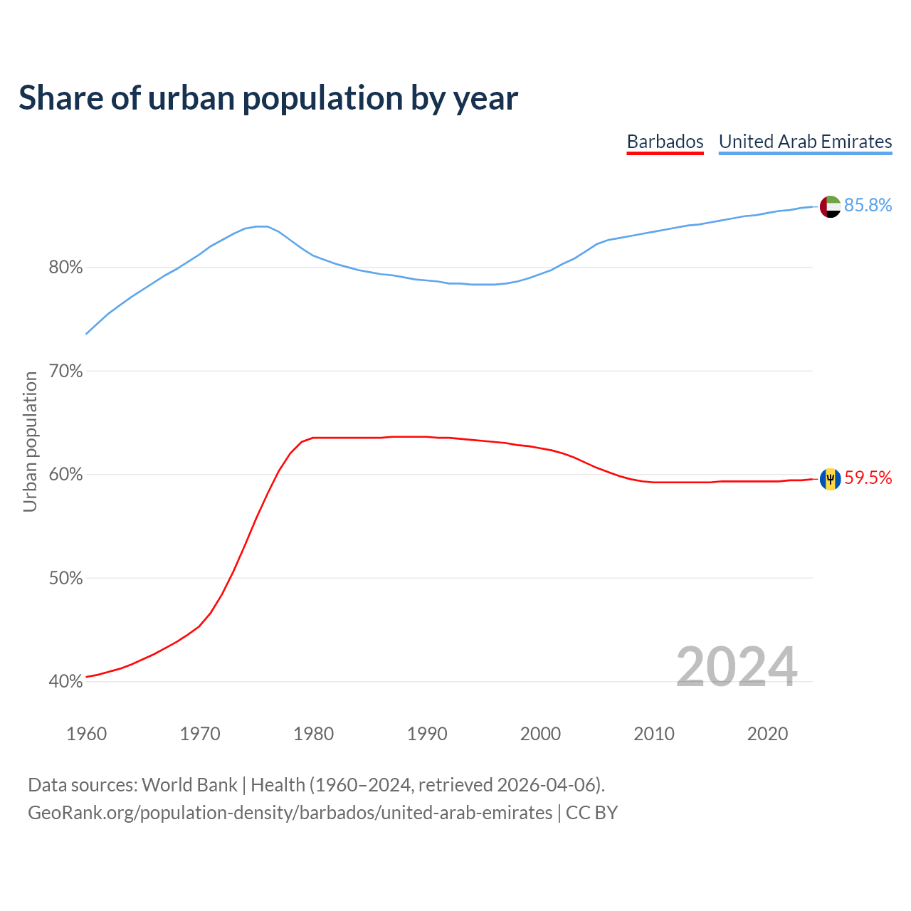 From 2004 to 2024, the share of urban population changed from 61.1% to 59.5% in Barbados and from 81.5% to 85.8% in the United Arab Emirates.