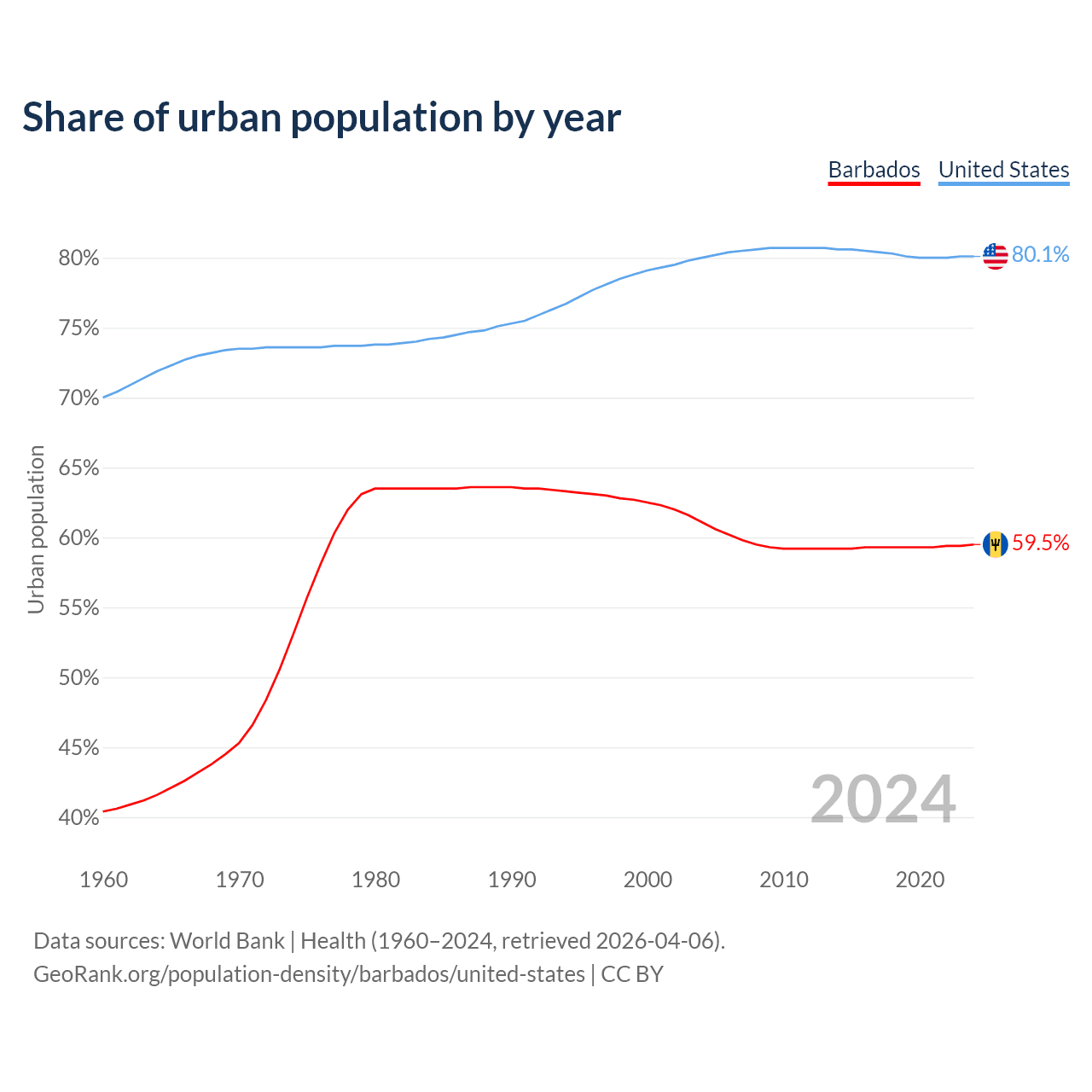 From 2004 to 2024, the share of urban population changed from 61.1% to 59.5% in Barbados and from 80% to 80.1% in the United States.