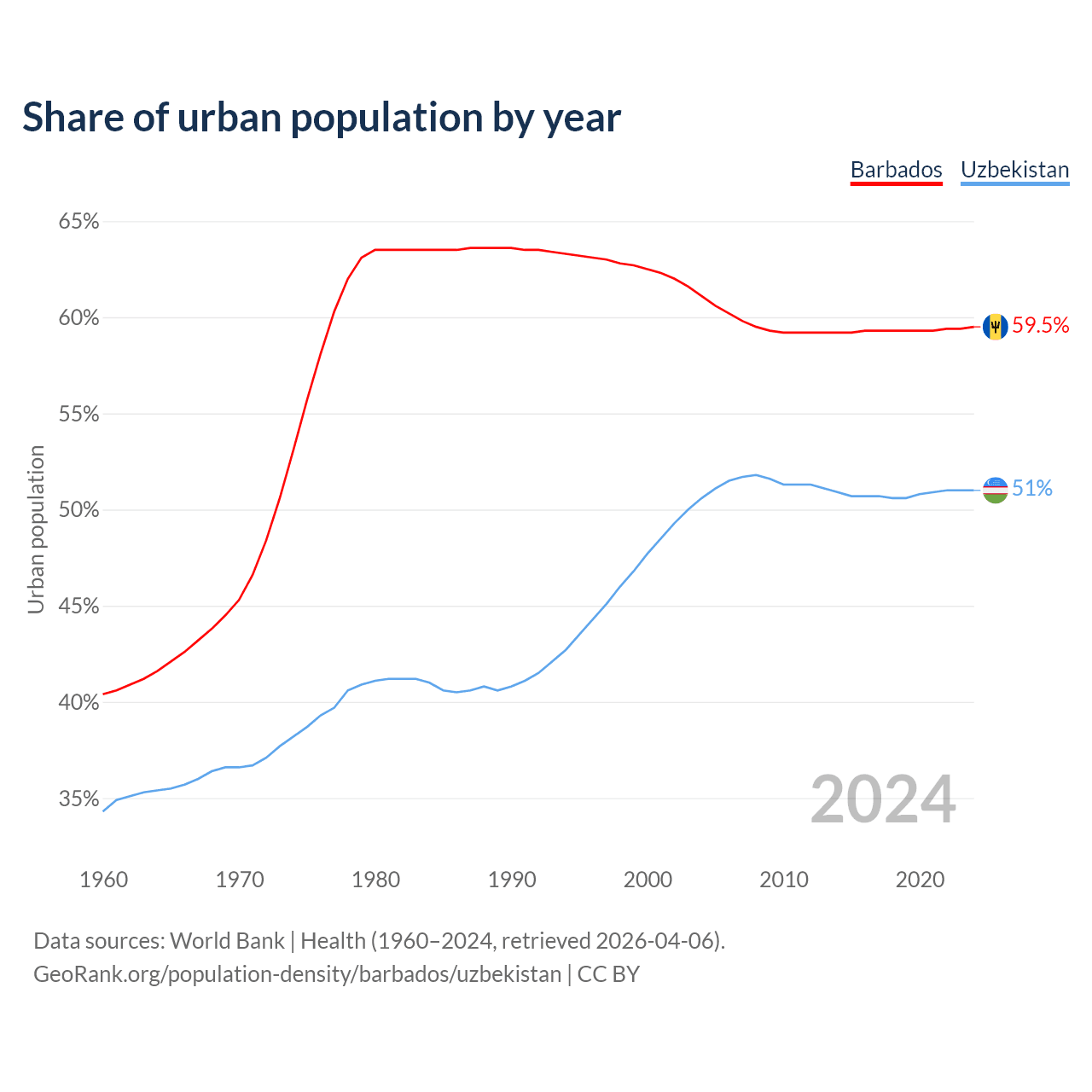 From 2004 to 2024, the share of urban population changed from 61.1% to 59.5% in Barbados and from 50.6% to 51% in Uzbekistan.