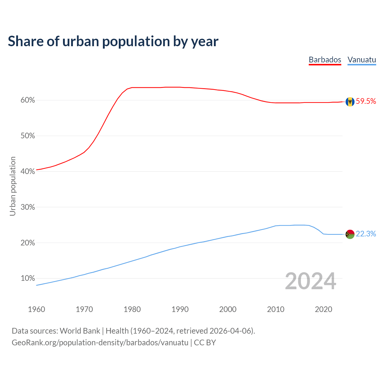 From 2004 to 2024, the share of urban population changed from 61.1% to 59.5% in Barbados and from 22.7% to 22.3% in Vanuatu.