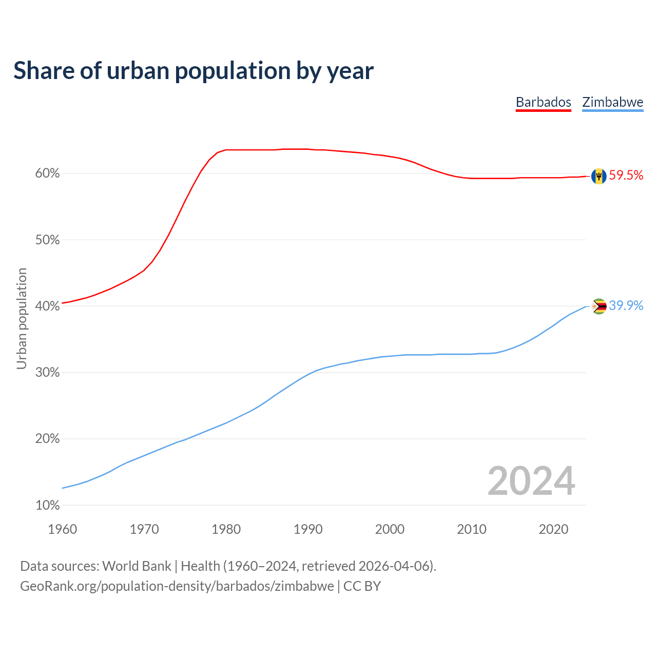 From 2004 to 2024, the share of urban population changed from 61.1% to 59.5% in Barbados and from 32.6% to 39.9% in Zimbabwe.