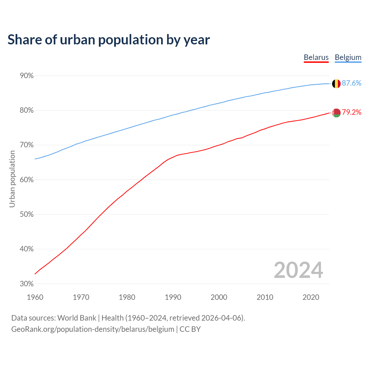 From 2004 to 2024, the share of urban population changed from 71.8% to 79.2% in Belarus and from 83.3% to 87.6% in Belgium.