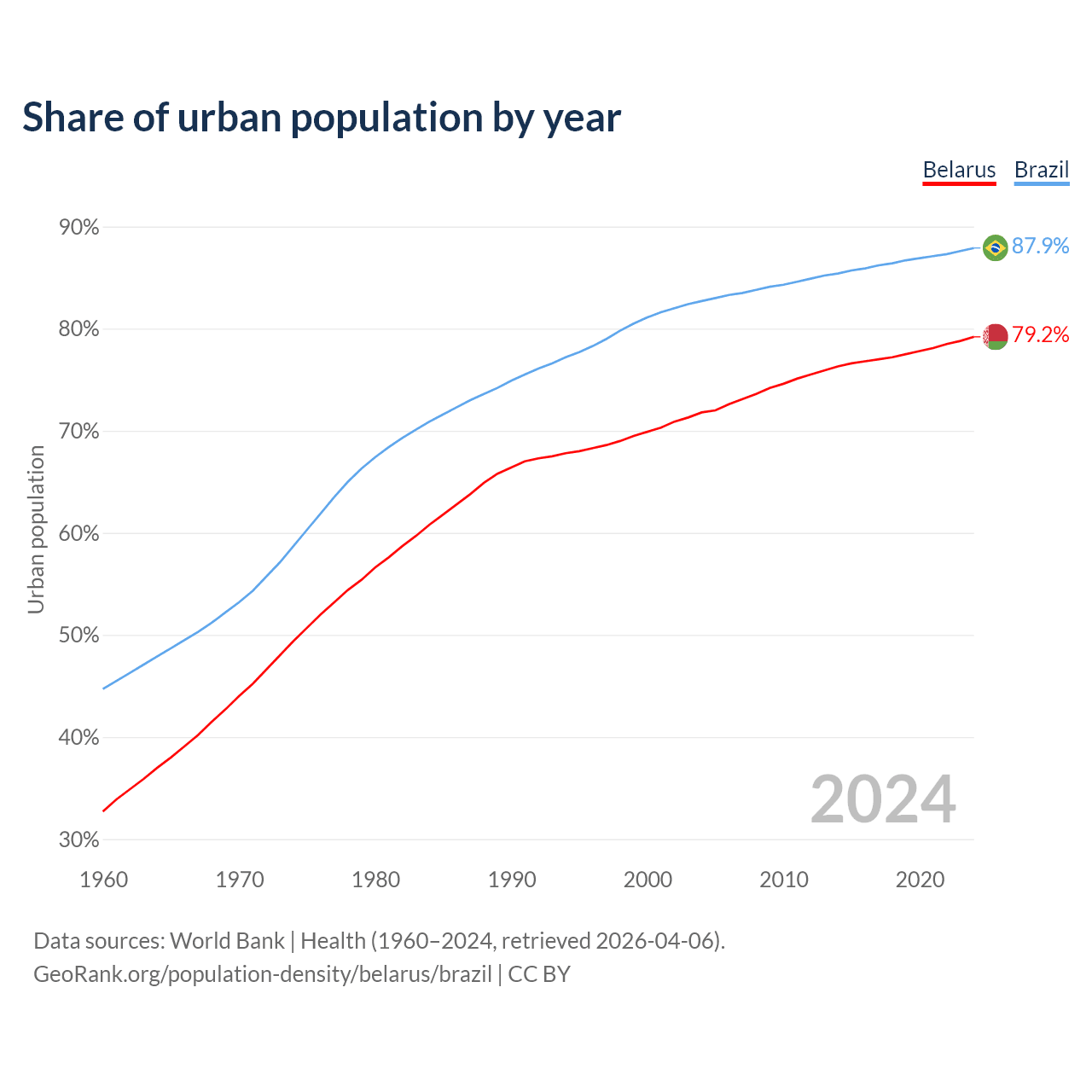 From 2004 to 2024, the share of urban population changed from 71.8% to 79.2% in Belarus and from 82.7% to 87.9% in Brazil.