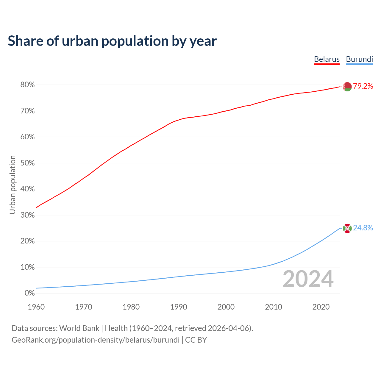 From 2004 to 2024, the share of urban population changed from 71.8% to 79.2% in Belarus and from 8.92% to 24.8% in Burundi.