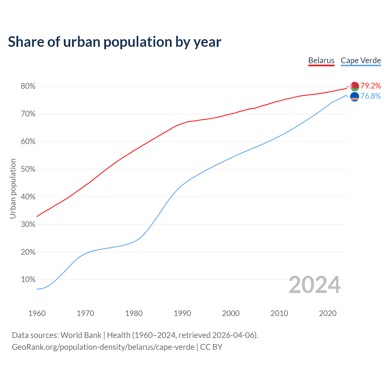 From 2004 to 2024, the share of urban population changed from 71.8% to 79.2% in Belarus and from 57.1% to 76.8% in Cape Verde.