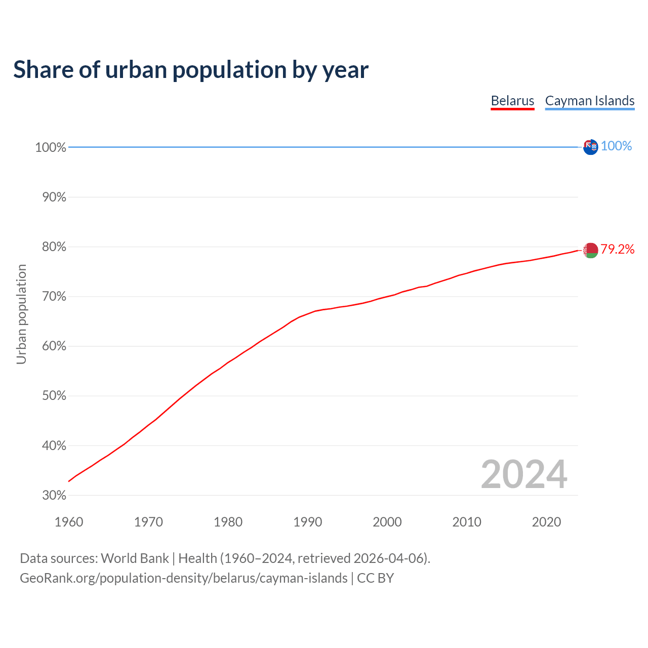 From 2004 to 2024, the share of urban population changed from 71.8% to 79.2% in Belarus and from 100% to 100% in the Cayman Islands.